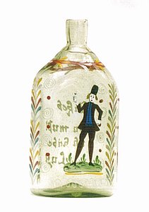 Renaissance folk art style bottle called "Pryska". Initially part of the Spring welcoming ritual practised in Easter time. Subsequently widespread as a liquor-bottle on folk weddings. Very popular with people in 17th and 18th century. The enamel painting on historical forest glass replica. Glass has nice greenish colour and contains small bubles. Very popular and original gift even at present.